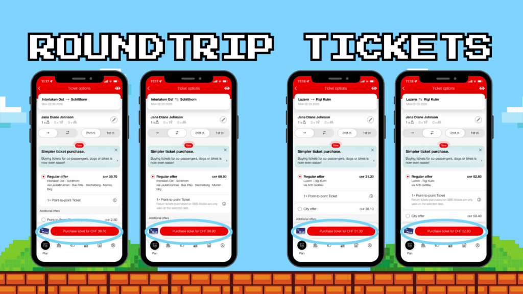 On routes like the Schilthorn or the cogwheel trains to Mt. Rigi, you’ll actually save money by purchasing a roundtrip ticket. But you unfortunately won’t know this unless you happen to look. So if you’re planning to go somewhere and return using the same route, just check to make sure you won’t be wasting money by purchasing one-way tickets.