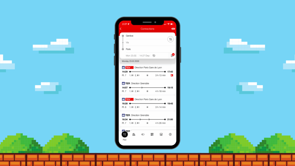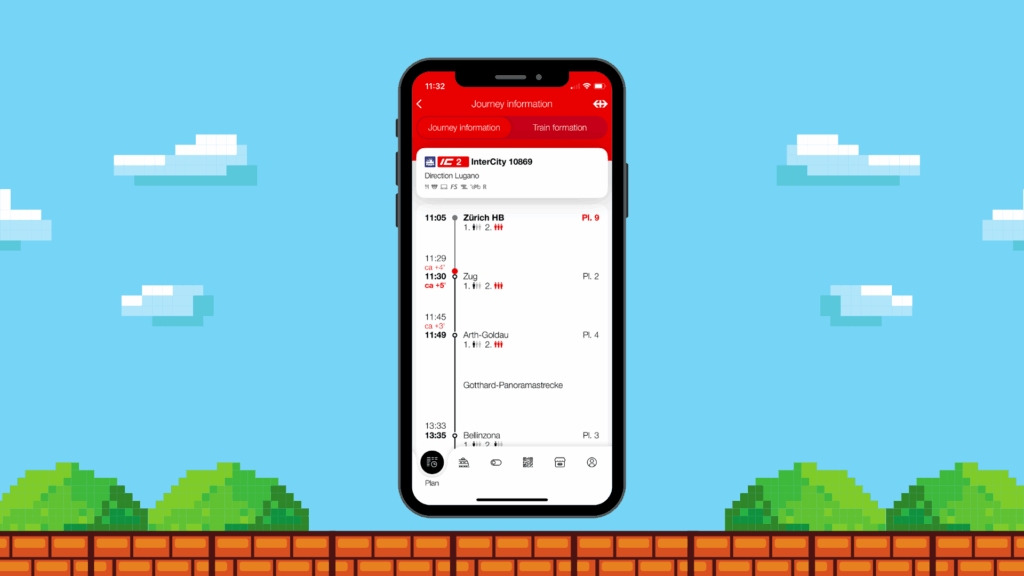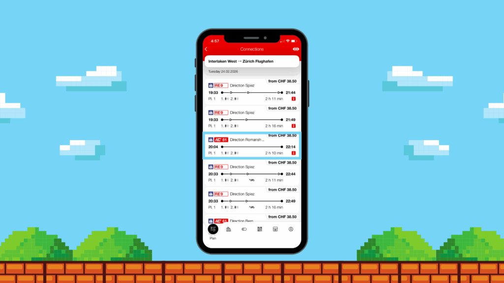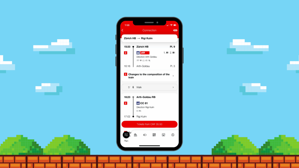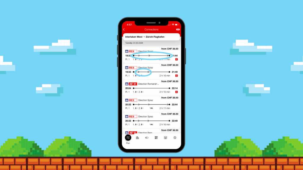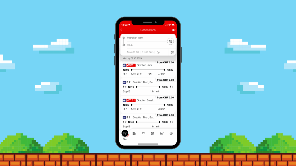 In the SBB App, enter the same “from” and “to” destinations. Now, triple tap the person’s face and your game magically opens. Jump over as many obstacles as possible and see if you can make a new high score. And because it’s so Swiss, there’s even a clock on the top of the screen to make sure you don’t lose track of time and miss your stop!