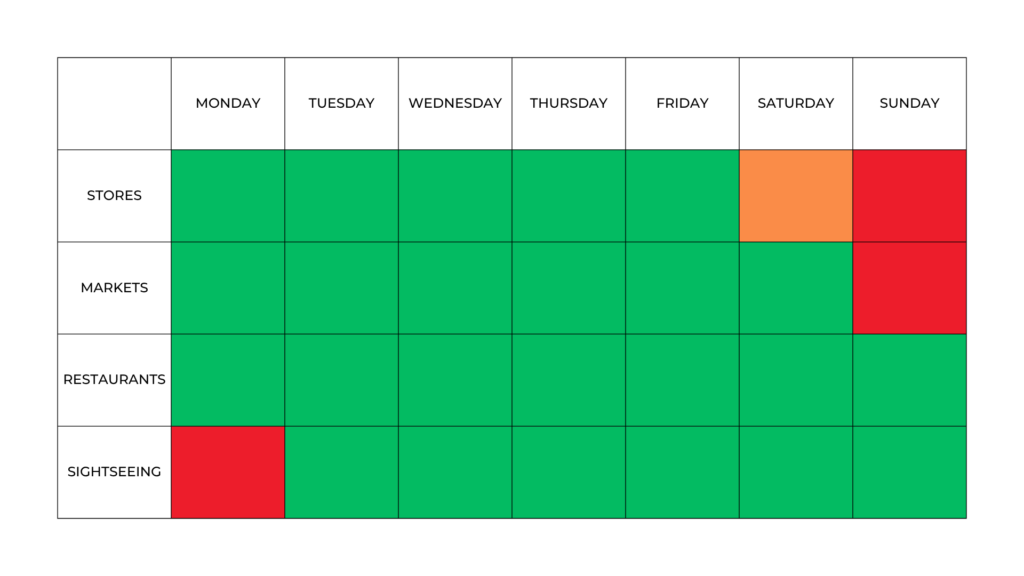 For most of your sightseeing activities, you shouldn’t have a problem on any day of the week — except for Mondays, which is when many museums are closed.